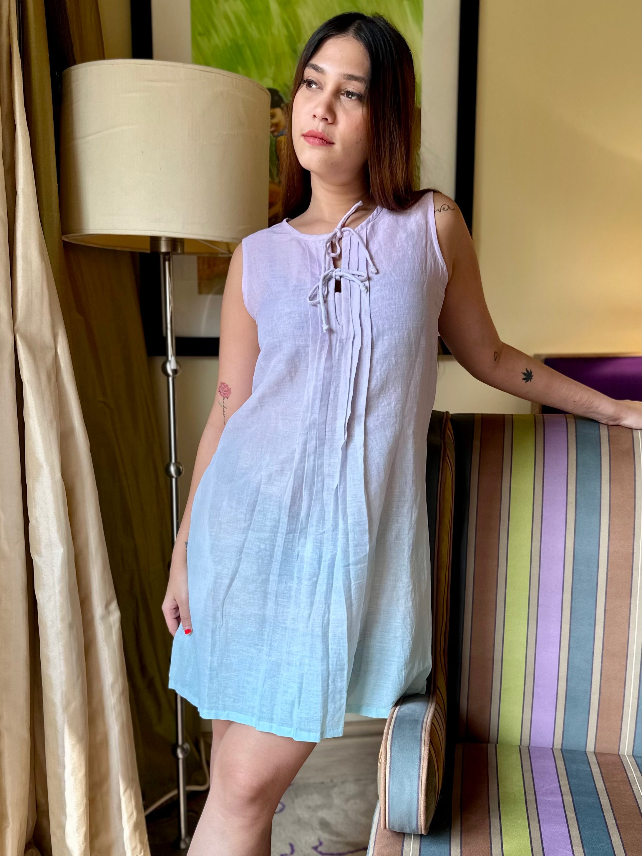 Crafted from high-quality linen, this sleeveless beauty is designed for comfort andbreathability. The pleated front neckline adds a subtle yet captivating detail. Embrace thelightness and breeze of Rene as you exude effortless style on your next getaway.