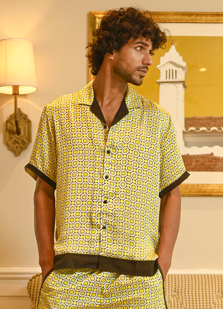 The Cut & Sew Cuban Satin Shirt in Geo Waves from our Summer Resort Collection.
