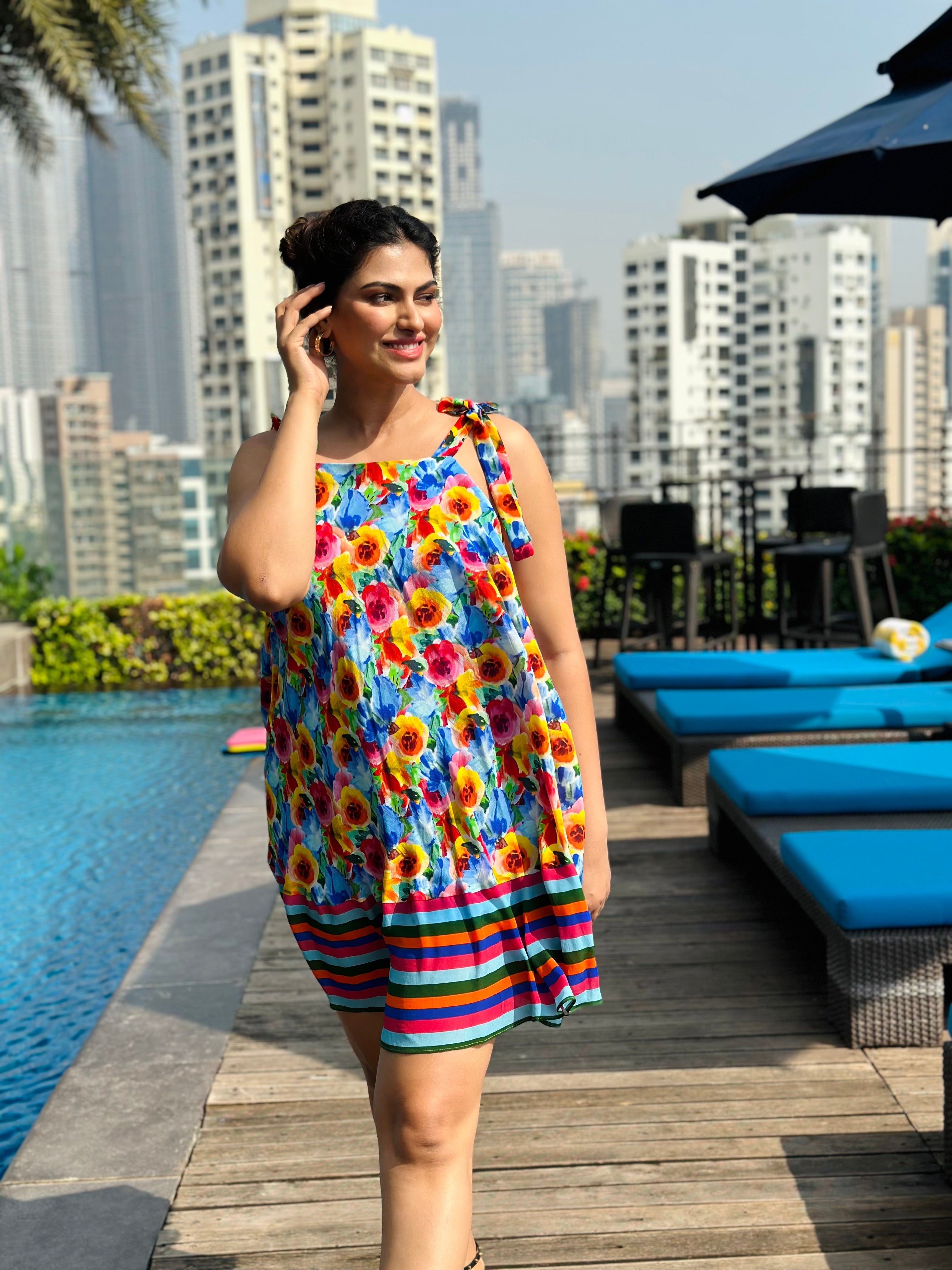 Presenting a lively multicolor mini dress from our Endless Summer Collection, featuring exuberant blossoms print. With a square neck, tie sleeves, and a flowy comfortable silhouette, it's an ideal choice for beach outings, resort retreats, or leisurely sunset strolls.