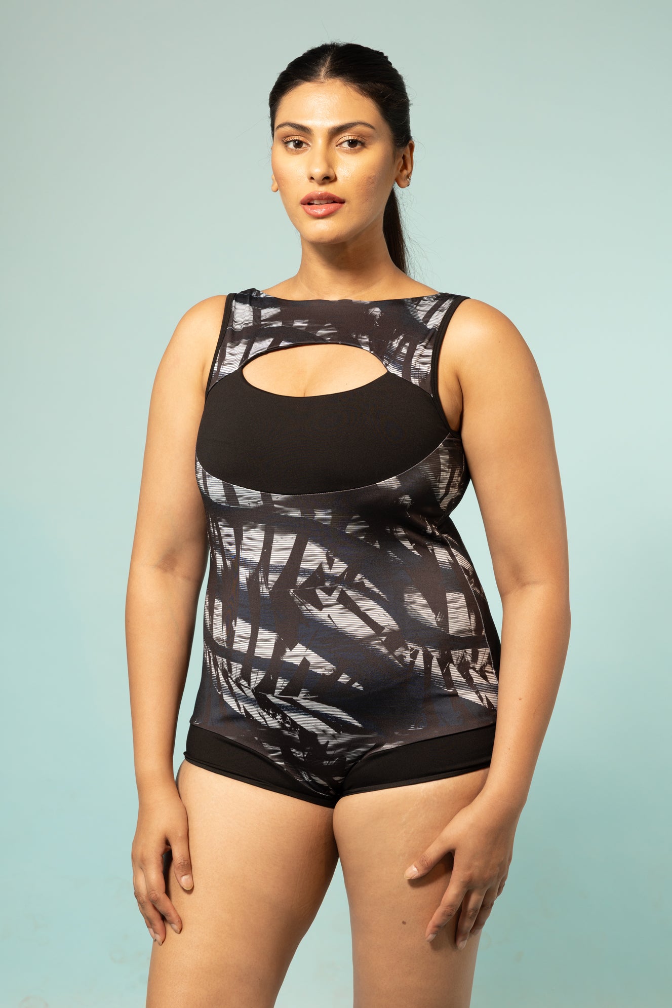 A sleek and sophisticated black sleeveless swimsuit featuring a subtle shadow foliage print, evoking the mystery of moonlit tropical leaves. This one-piece boasts a high boat neckline for an elegant touch, while a strategic front cut-out adds a hint of allure.