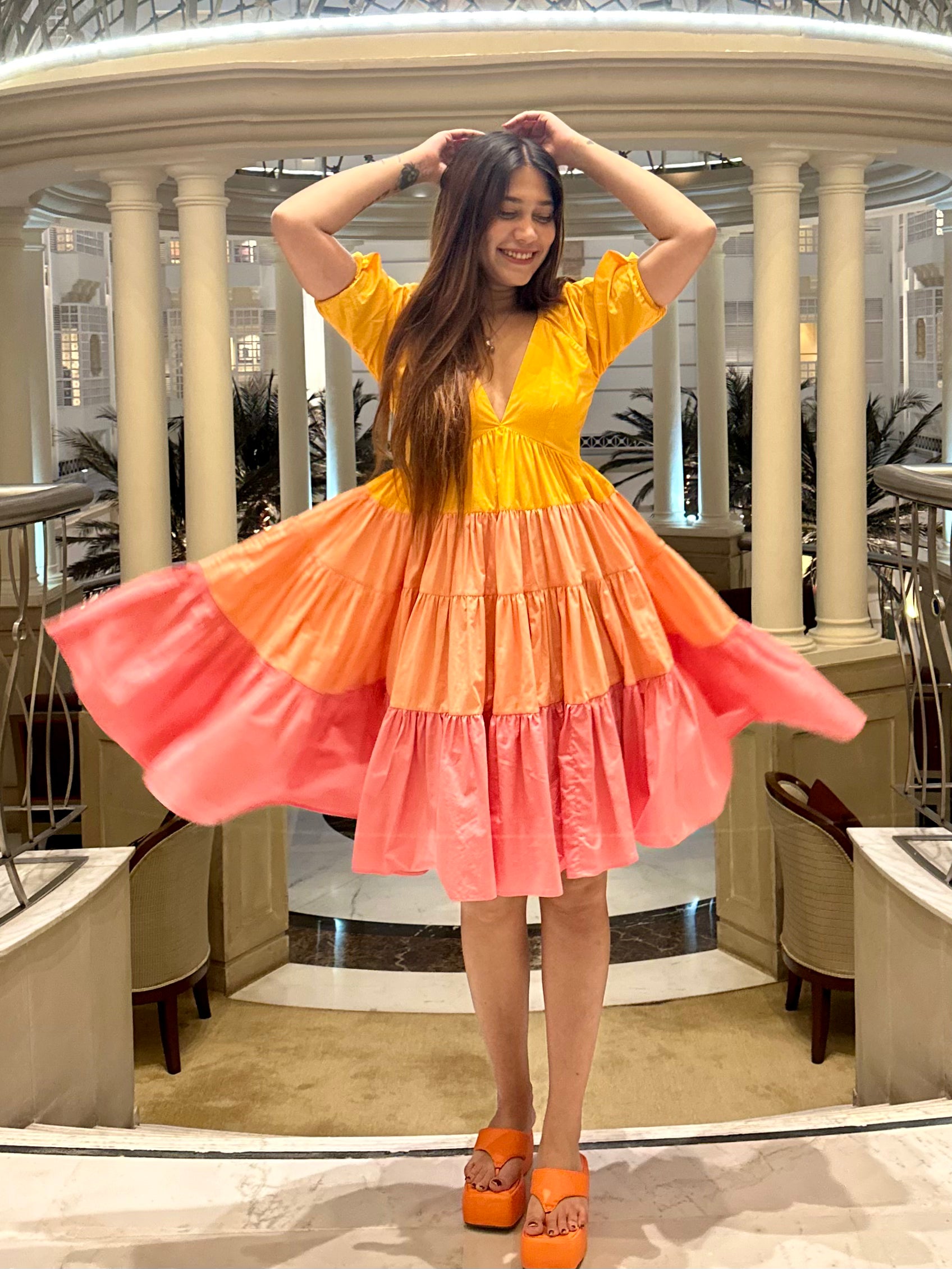 DESCRIPTION: Introducing our stunning Fiji Midi Dress, a true masterpiece of style and sophistication. This gather dress is designed to turn heads with its striking colorblocking of vibrant orange, salmon pink, and soft pink. The puff sleeves add a touch of elegance, while the deep neckline adds a hint of allure. Crafted with meticulous attention to detail, this dress is perfect for any occasion, whether it's a brunch date or a night out on the town.