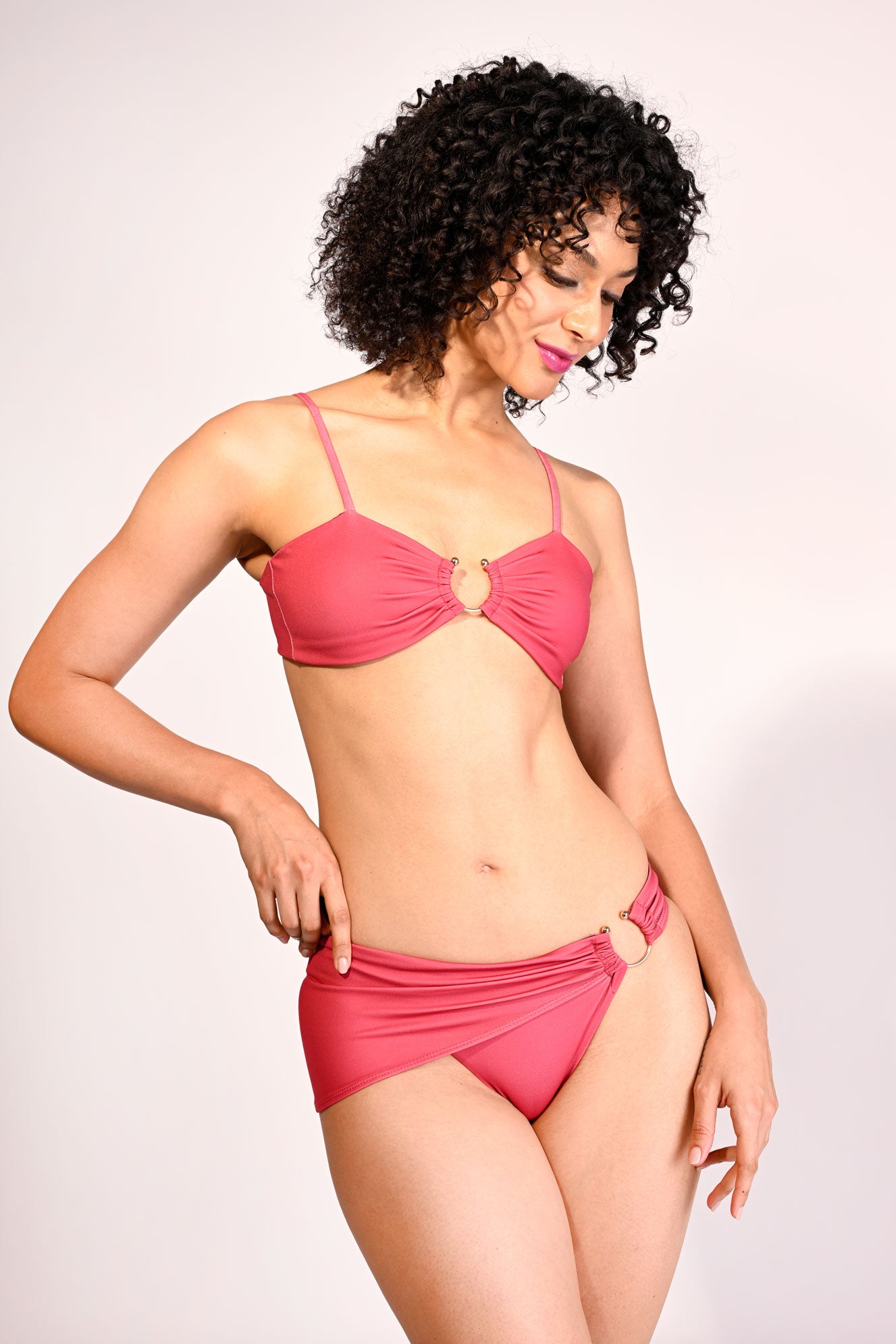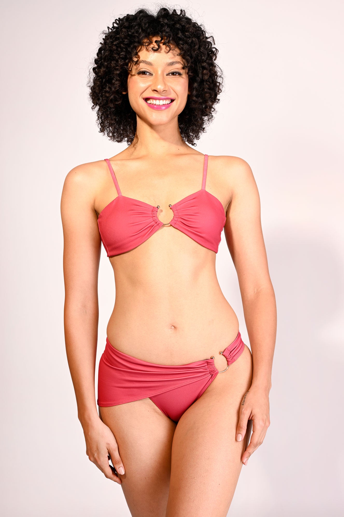 Style & Fit: The bottoms mirror this elegance with a matching metal ring closure at the hip, creating a balanced, high-fashion allure. Designed for a flattering, sculpted fit, the bikini offers adjustable straps and a minimal coverage bottom, making it perfect for sun-soaked luxury. UV protection.