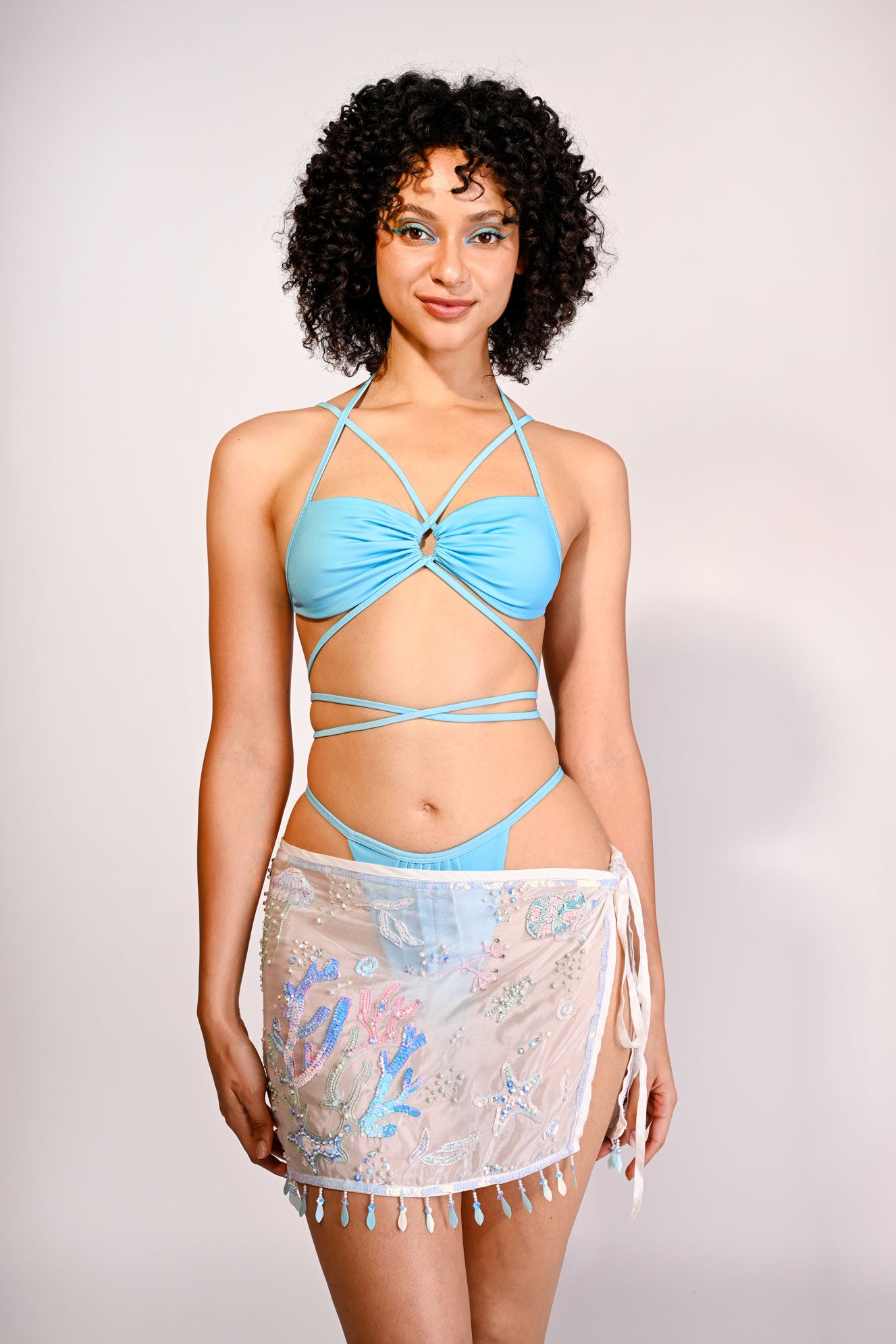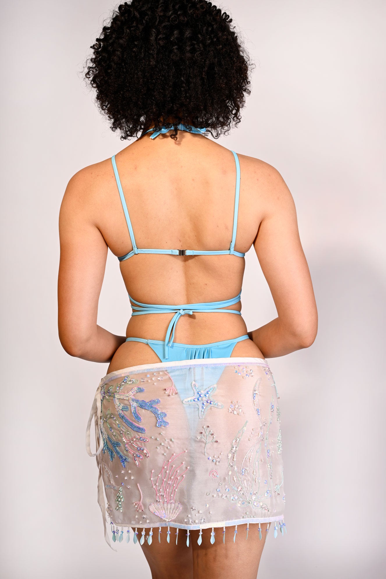 - Designed with a soft side-tie and playful beaded hem, it drapes effortlessly at the hips, adding texture and charm without overpowering your swimwear. Light, airy, and quietly luxurious, Pearl Tide is perfect for beach strolls, poolside lounging, and sun-drenched resort afternoons.